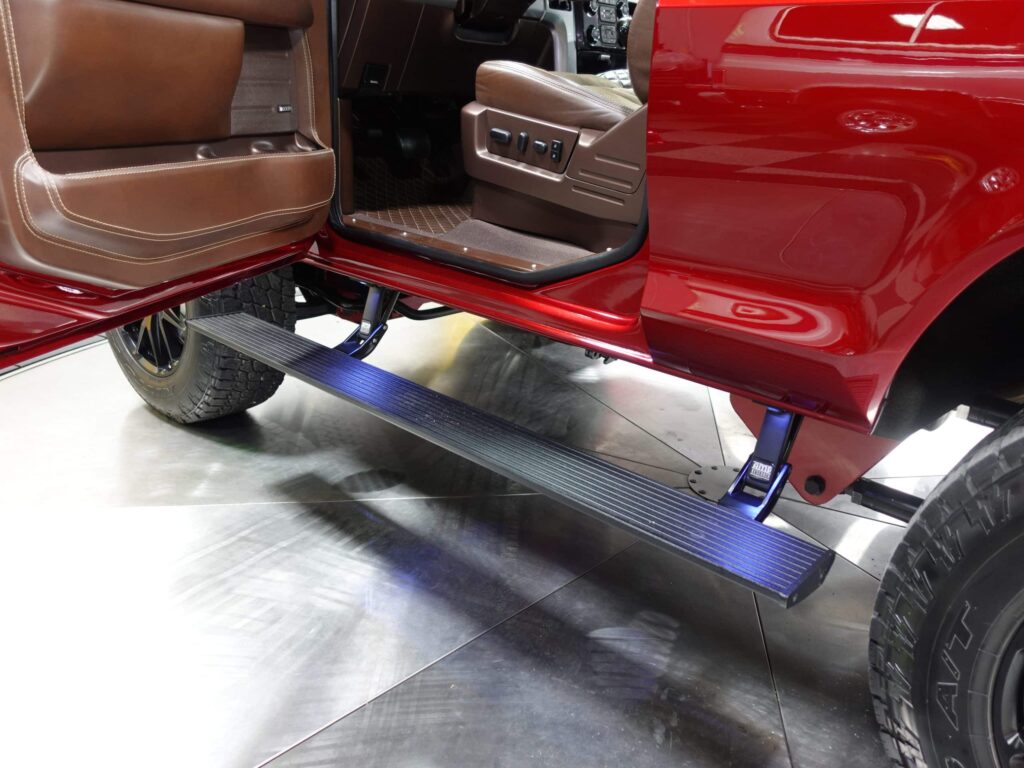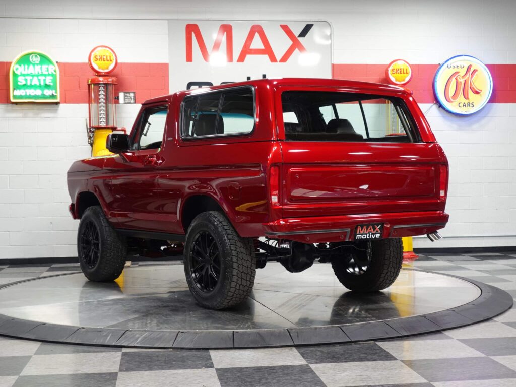 1979 Ford Bronco was thoroughly and thoughtfully reengineered by the talented crew at Cleveland Power and Performance. High end upgrades abound, from the custom blended 3-stage Crimson paint, through the Roush Supercharged 5.0L Coyote V8 engine, to the custom-built Cleveland Power and Performance tube steel chassis. The odometer has recorded 21803 total miles since the vehicle was new, but after this comprehensive build, the Bronco has been driven just 1243 miles. The Coyote exhales through Kooks long tube headers and a custom-built exhaust system with Kooks resonators. A 6R80 6-speed automatic transmission sends the power through a 4-mode electronic transfer case to a 9.75-inch rear with 3.73 gears and to the front 3.73-geared carrier when needed. The body shop crew augmented the custom Crimson paint with bold metallic silver in strategic spots on the exterior, the interior, and engine compartment. Hand-built front and rear body colored bumpers hide in plain sight, along with modern mirrors and door handles, and a handbuilt grille paying homage to both new and old Ford design concepts. The interior, based on a late model F-150, is elegant and luxurious with custom stitched leather and suede seating, custom floor mats, and a suede headliner. The driver’s seat is 10-way adjustable, and is heated and cooled. The 8-inch LCD media center includes navigation. The chassis is tied together with a full roll cage, subtly integrated with the interior. The chassis sports a 4-link rear, Belltech coilovers all around, and Brembo brakes highlighted by painted 6-piston front calipers with 15.8 inch (!) rotors. The all-important wheel and tire combo doesn’t disappoint either. It showcases big blacked-out 20×10” Forgeline VX1-6 forged aluminum wheels wrapped in 35×11.50R20 Nitto Terra Grappler G2 All-Terrain tires. Details like the LED lights up front, dual chrome exhaust tips and even a drive shaft loop hint at the premium quality of this build. Please be sure to see the detailed photos at www.maxmotive.com.